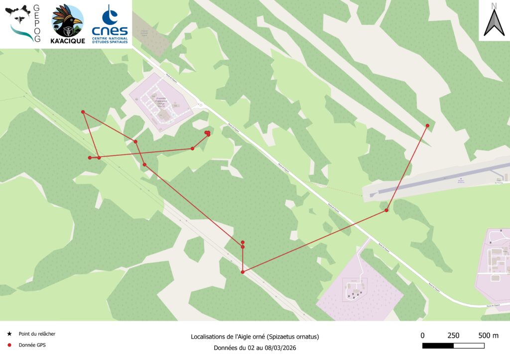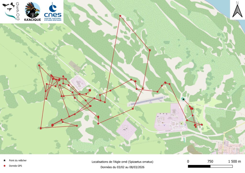 Espèce forestière peu commune, rare sur le littoral guyanais et classée « quasi menacée » sur la liste rouge mondiale, l’Aigle orné reste encore mal connu. À l’occasion de ce relâcher exceptionnel, le GEPOG a équipé l’oiseau d’une balise solaire ARGOS/GPS.